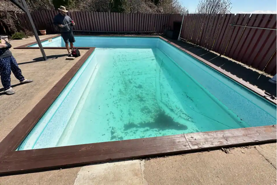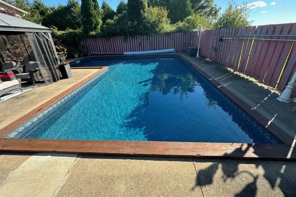 This recent pool liner replacement in Grimsby featured a worn vinyl liner that had faded and developed small leaks. We removed the old liner, inspected the pool walls and floor, and installed a new custom vinyl liner. The result is a clean modern look and a fully sealed pool ready for the season.